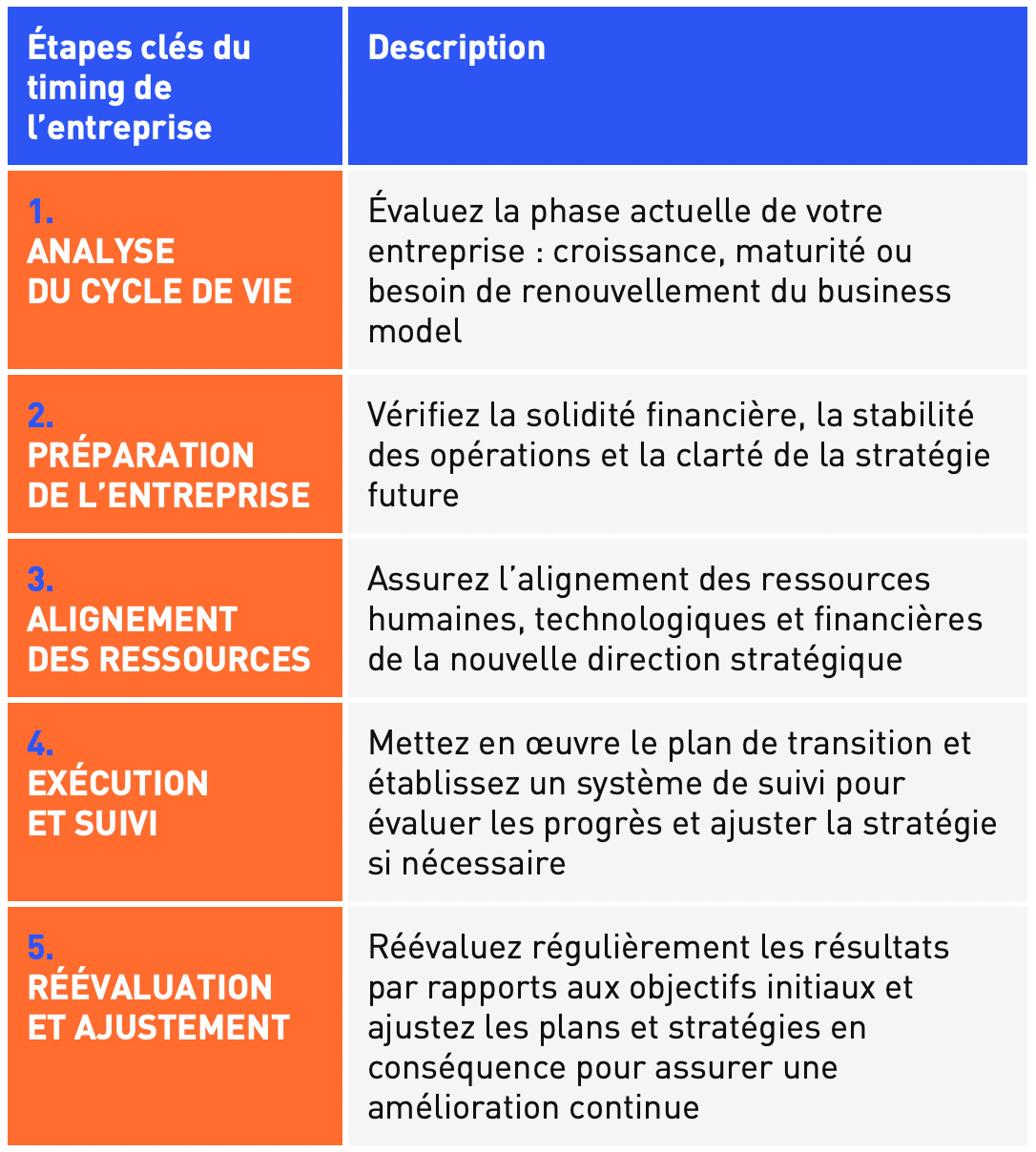 Analyse du cycle de vie : déterminez où se situe votre entreprise dans son cycle de vie (croissance, maturité, renouvellement nécessaire du business model). Cela aidera à comprendre si c’est le bon moment pour une transmission.